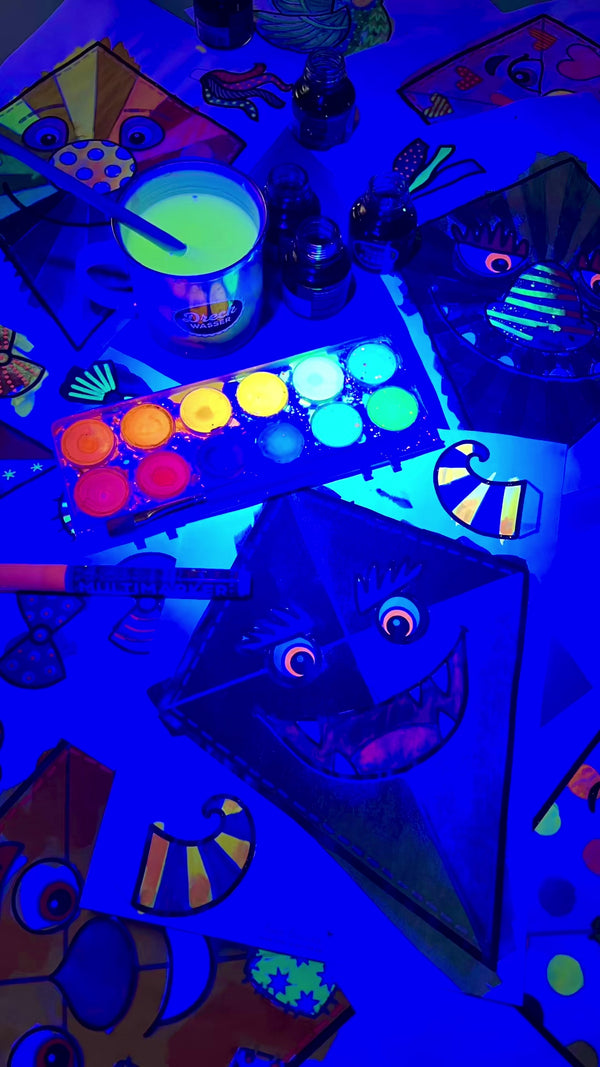 Das Papier bemalen und ausschneiden. Für leuchtende Fensterbilder 80g Normalpapier verwenden und das Papier zum Schluss auf der Rückseite einölen, damit es transparent wird.